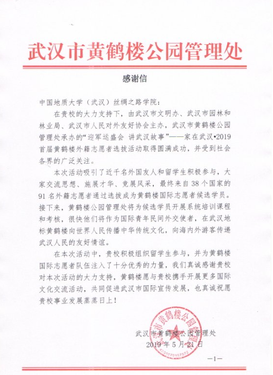 (通讯员:杨素)2019年6月10日,黄鹤楼公园管理处给公司发来感谢信,赞扬公司丝绸之路学院为“军运会国际志愿者”注入优秀力量。